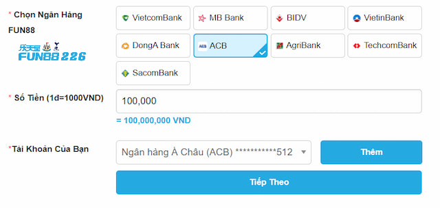 • Bước 2: Lựa chọn ngân hàng là một trong những ngân hàng sau. Vietcombank, BIDV, Techcombank, Sacombank, Vietinbank, ACB. Đây là những ngân hàng đã liên kết với Fun88 nên thuận tiện và phù hợp nhất để thực hiện giao dịch.