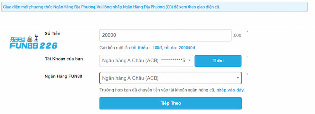 Người chơi tại Fun88 cần lấy STK mà Fun88 cung cấp rồi chuyển vào. Sau đó, thực hiện lệnh gửi tiền trên trang web của nhà cái Fun88.